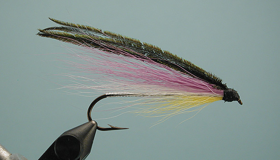 Wings: White Bucktail, under Chartreuse Goat, Crystal Rainbow, Under Fluorescent Pink Bucktail, under 6 Strands Peacock Herl