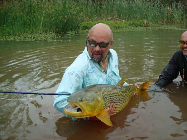 Sharing feelings with Pablo my guide, with the biggest dorado (34 Lbs.) I ever caught - Rio Juramento, Salta, Argentina. Rod, Sage Xi2, 10 weight. foot long black fly on 4/0 Tiemco 600SP hook.